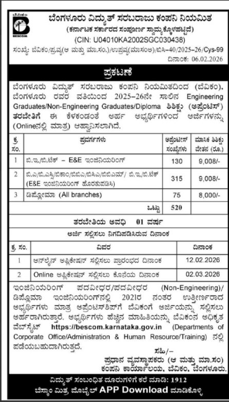 BESCOM Recruitment 2026: Bangalore Electricity Supply Company Limited has released a notification on its official website to fill 520 Apprentices posts. Those who are interested in joining BESCOM and are looking for a government job can apply online before 02 March 2026. Read more information about these posts and download the notification through the link given below.