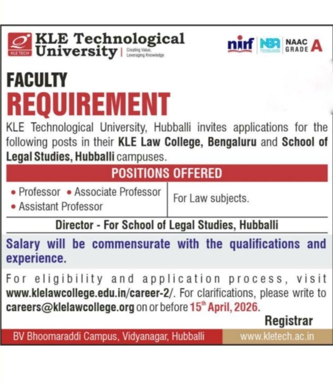 KLE Technological University Recruitment 2026: KLE Technological University, Hubballi has released a notification on its official website to fill the Professor, Associate Professor, Assistant Professor posts. Those who are interested in joining KLE Technological University and are looking for a government job can apply online before 15 April 2026. Read more information about these posts and download the notification through the link given below.