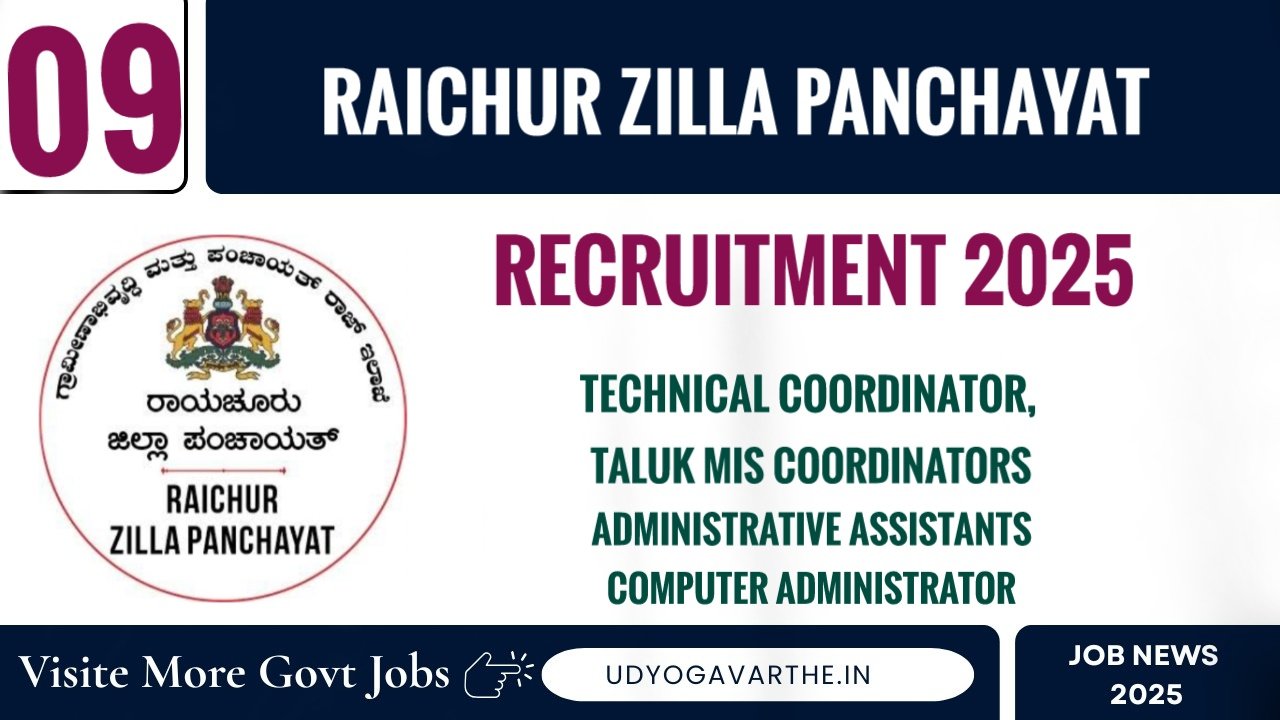 Raichur Zilla Panchayat Recruitment 2025: Raichur Zilla Panchayat has released a notification on its official website to fill 09 Technical Coordinator, Computer Administrator, Administrative Assistants, Taluk MIS Coordinators posts. Those who are interested in joining Zilla Panchayat and those who are looking for a government job in Raichur can apply online before 24 December 2025. Read more information about these posts and download the notification through the link given below.